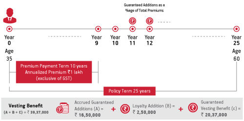 • For a Regular Pay policy, Guaranteed Additions accrue at the end of each policy year starting from the end of the first policy year onwards till the date of vesting i.e., till the end of the Policy Term.