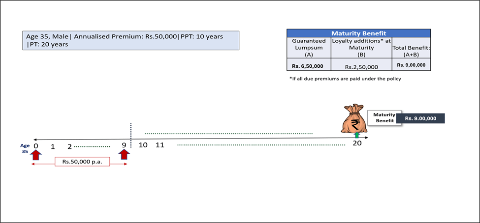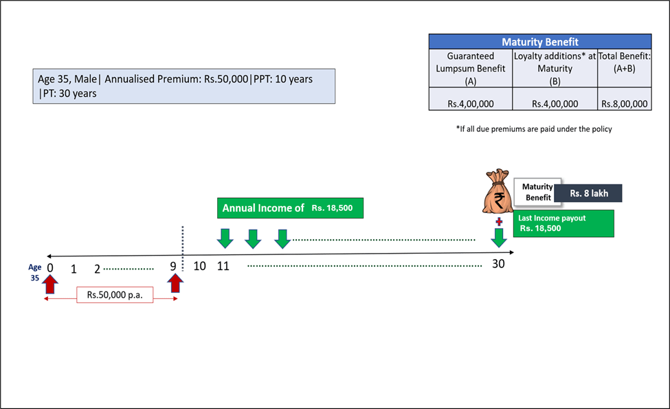 - Income with Lumpsum Option: On survival of the Life Insured till the end of every policy year following the completion of the Premium Payment Term, Income Benefit, expressed as a percentage of Annualized Premium, will be paid to you.