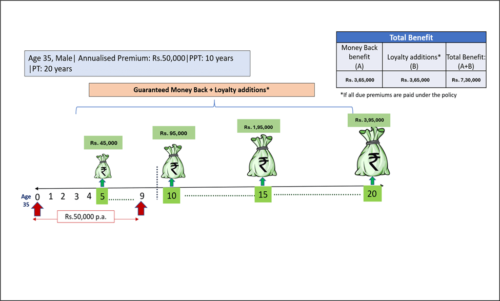 Moneyback Option: Loyalty Addition shall be paid at the end of every 5th policy year, along with the money back benefit payouts provided all due premiums have been paid.