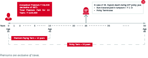 *LI Age 35, Male, Non Smoker, Option 2: Return of Premium (ROP), PPT: Regular Pay, SA: 1 Cr., PT: Up to Age 85 (50 years), Annual Premium: Rs. 31,700 p.a., Rs. 2642 p.m. Premiums exclusive of GST. On death, 1 Cr SA is paid and the policy terminates. In case of survival until the end of the PT, Rs. 15,85,000 is returned as an ROP benefit.