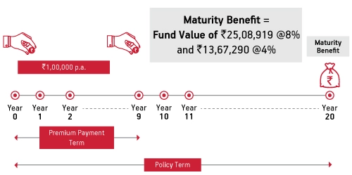 Mr. Bhatt opts for ABSLI Fortune Wealth Plan – Classic Option with Policy term of 20 years and Premium paying term of 10 years & chooses Smart Option. His annual premium is Rs. 1,00,000 and premium due date is 1st of January every year.